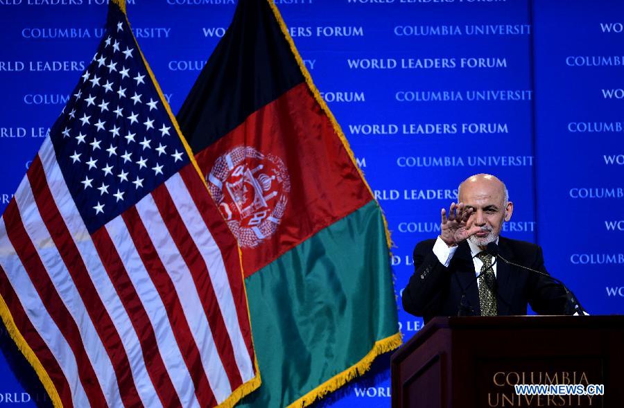 | Afghan President Ashraf Ghani speaks during Columbia's World Leaders Forum at Columbia University in New York, the United States, on March 26, 2015. (Xinhua/Wang Lei) |