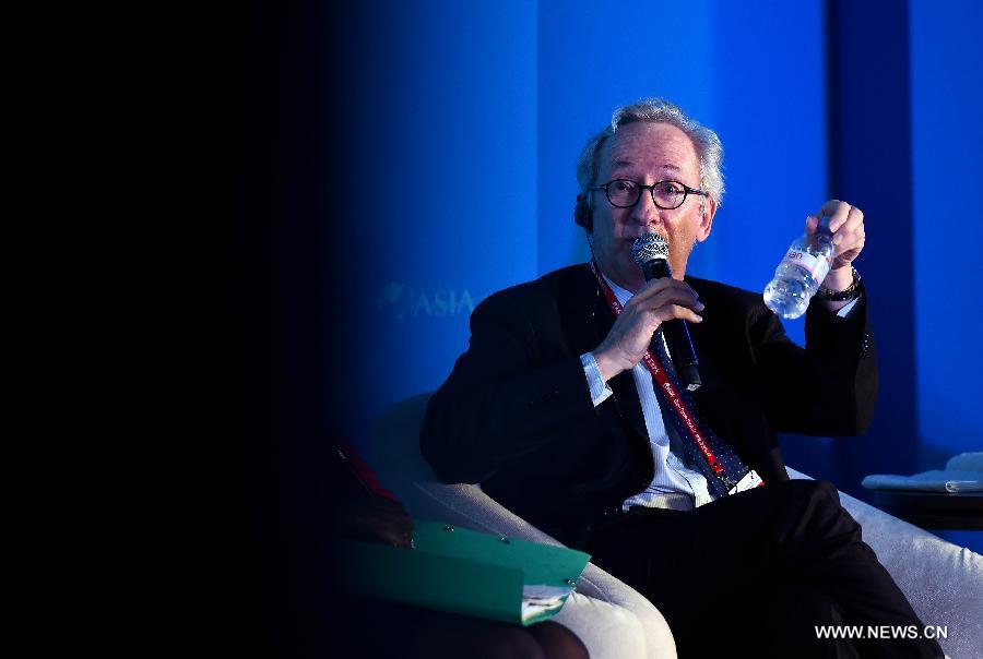 | Chairman and CEO of Groupe Danone Franck Riboud speaks at the sub-forum with the theme of "Global Governance for Food Safety" during the 2015 Boao Forum for Asia (BFA) in Boao, south China's Hainan Province, March 27, 2015. (Xinhua/Guo Cheng) |