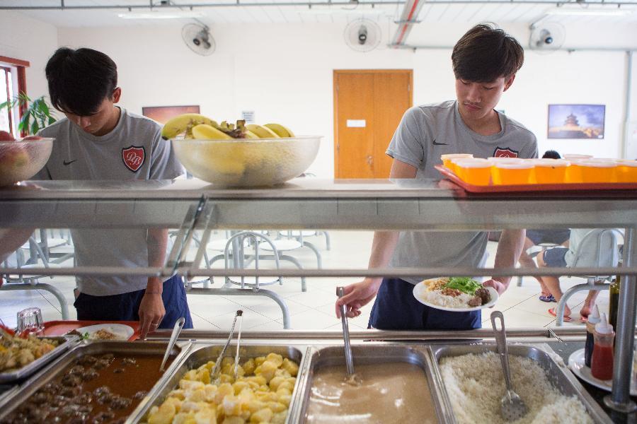 | Young player Gao Mingyang (R) takes food in the canteen at Luneng Brazil Sports Center in Porto Feliz, Brazil, March 25, 2015. As a milestone of China's Shandong Luneng Football Club's youth training project, Luneng Brazil Sports Center opend in mid-July of 2014. The 160,000-square-meter sports center, located about 100 kilometers outside Brazil's largest city Sao Paulo, has five standard pitches and two futsal fields. It can accommodate 190 people and includes player apartments, a restaurant, gym, physical therapy room, activity room, meeting room and swimming pool. As the Brazilian base, the Luneng Brazil Sports Center is not only for the youth of Luneng football club, but also for domestic and international club teams and national teams at all levels. The best players aged between 14 and 17 will be selected from Luneng Football School and come to Brazil to learn football techniques and participate in the Brazilian youth league. In order to be rooted in the atmosphere of Brazilian football, Luneng worked out a newly-designed training plan. Chinese players will join the Brazilian players of the same age to train and compete together. They live in the same dormitory, eat in the same canteen, help each others so that they can learn from each others. (Xinhua/Xu Zijian) |