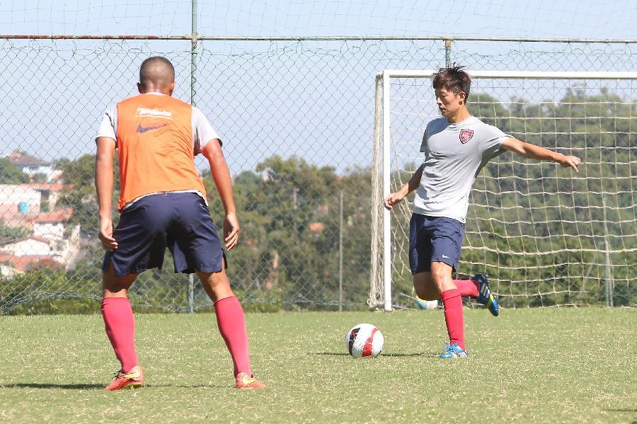 | Young player Chen Guoliang (R) trains with a Brazilian young player at Luneng Brazil Sports Center in Porto Feliz, Brazil, March 25, 2015. As a milestone of China's Shandong Luneng Football Club's youth training project, Luneng Brazil Sports Center opend in mid-July of 2014. The 160,000-square-meter sports center, located about 100 kilometers outside Brazil's largest city Sao Paulo, has five standard pitches and two futsal fields. It can accommodate 190 people and includes player apartments, a restaurant, gym, physical therapy room, activity room, meeting room and swimming pool. As the Brazilian base, the Luneng Brazil Sports Center is not only for the youth of Luneng football club, but also for domestic and international club teams and national teams at all levels. The best players aged between 14 and 17 will be selected from Luneng Football School and come to Brazil to learn football techniques and participate in the Brazilian youth league. In order to be rooted in the atmosphere of Brazilian football, Luneng worked out a newly-designed training plan. Chinese players will join the Brazilian players of the same age to train and compete together. They live in the same dormitory, eat in the same canteen, help each others so that they can learn from each others. (Xinhua/Xu Zijian) |