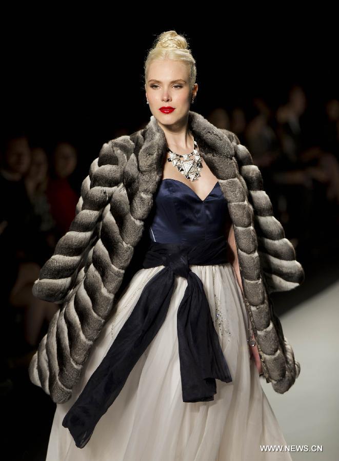 A model presents a creation of Farley Chatto's Czar Nicholas Collection during the World MasterCard Toronto Fashion Week Fall 2015 in Toronto, Canada, March 26, 2015. (Xinhua/Zou Zheng)
