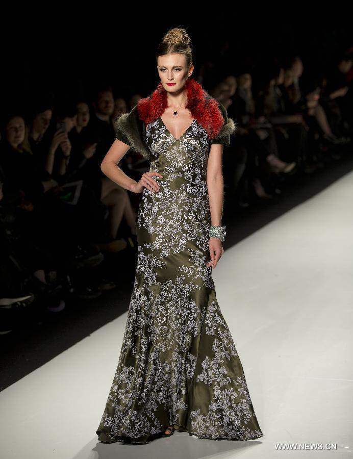 A model presents a creation of Farley Chatto's Czar Nicholas Collection during the World MasterCard Toronto Fashion Week Fall 2015 in Toronto, Canada, March 26, 2015. (Xinhua/Zou Zheng)