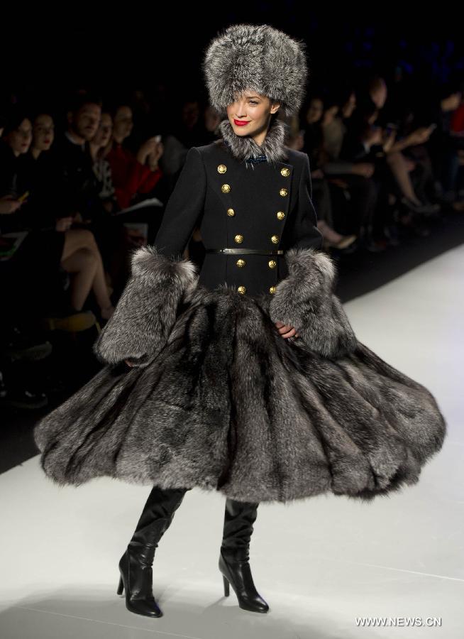 A model presents a creation of Farley Chatto's Czar Nicholas Collection during the World MasterCard Toronto Fashion Week Fall 2015 in Toronto, Canada, March 26, 2015. (Xinhua/Zou Zheng)