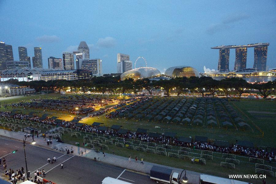 People queue in line at Singapore's Padang to get into Parliament House to pay their last respects to Singapore's founding Prime Minister Lee Kuan Yew on March 26, 2015. The body of Singapore's founding Prime Minister Lee Kuan Yew will be laid in state at Parliament House from March 25 to March 28 for public to pay their last respects. (Xinhua/Then Chih Wey)
