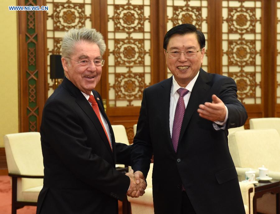 | Zhang Dejiang (R), chairman of the Standing Committee of China's National People's Congress, meets with Austrian President Heinz Fischer at the Great Hall of the People in Beijing, capital of China, March 27, 2015. (Xinhua/Li Xueren) |