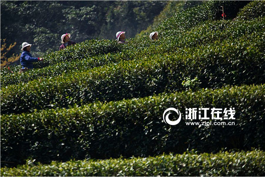 It is the annual season for tea-leaves picking in Meijiawu, Hangzhou. Looking down from above, the boundless green field, golden sunshine, and beautiful tea picking girls in colorful clothes composed an exquisite picture of the spring. (Zhejiang Online/Ni Yanqiang)
