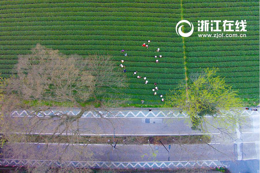 It is the annual season for tea-leaves picking in Meijiawu, Hangzhou. Looking down from above, the boundless green field, golden sunshine, and beautiful tea picking girls in colorful clothes composed an exquisite picture of the spring. (Zhejiang Online/Ni Yanqiang)