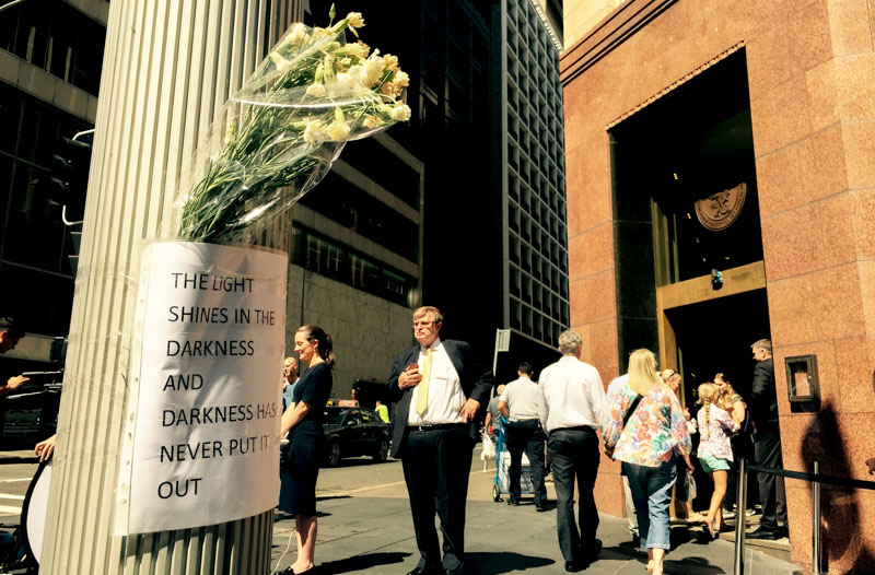 The cafe had its reopening with Joel Herat, one of the survivors of the siege, back at work. Two plaques, in the honor of the employee, Tori Johnson, and customer, Katrina Dawson who died in the siege, were put up at the front door entrance. A note on a flower bouquet outside the entrance read, "The light shines in the darkness and darkness has never put it out."