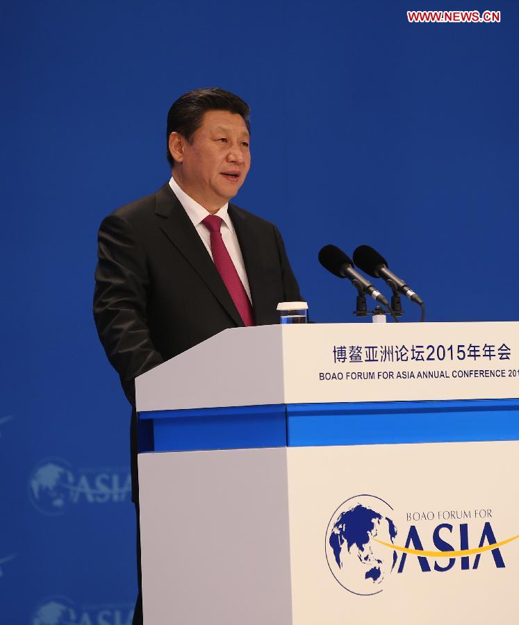 | Chinese President Xi Jinpingdelivers a keynote speech at the opening plenary of the 2015 annual conference of the Boao Forum for Asia (BFA) in Boao, south China's Hainan Province, March 28, 2015. (Xinhua/Lan Hongguang) |