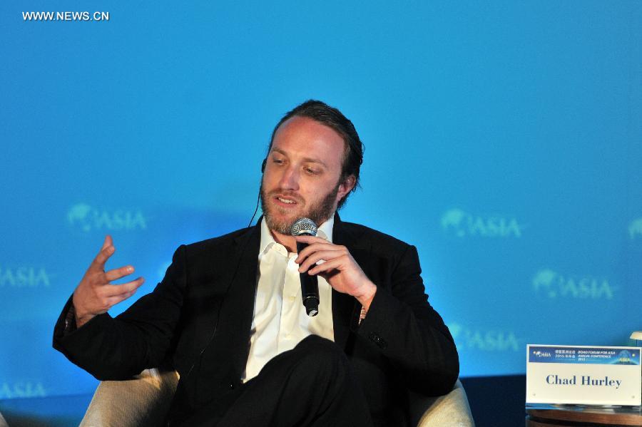 Chad Hurley, co-founder and former chief executive officer of YouTube, speaks during a sub-forum with the theme of "Entrepreneurs: Born or Made?" at the 2015 Boao Forum for Asia (BFA) in Boao, south China's Hainan Province, March 28, 2015. (Xinhua/Yang Guanyu)