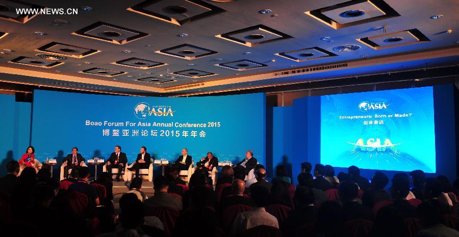 Participants attend a sub-forum with the theme of "Entrepreneurs: Born or Made?" at the 2015 Boao Forum for Asia (BFA) in Boao, south China's Hainan Province, March 28, 2015. (Xinhua/Yang Guanyu)