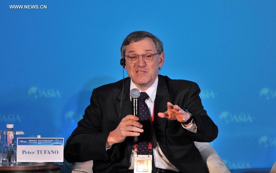 Peter Tufano, dean of the Said Business School of the University of Oxford, speaks during a sub-forum with the theme of "Entrepreneurs: Born or Made?" at the 2015 Boao Forum for Asia (BFA) in Boao, south China's Hainan Province, March 28, 2015. (Xinhua/Yang Guanyu)