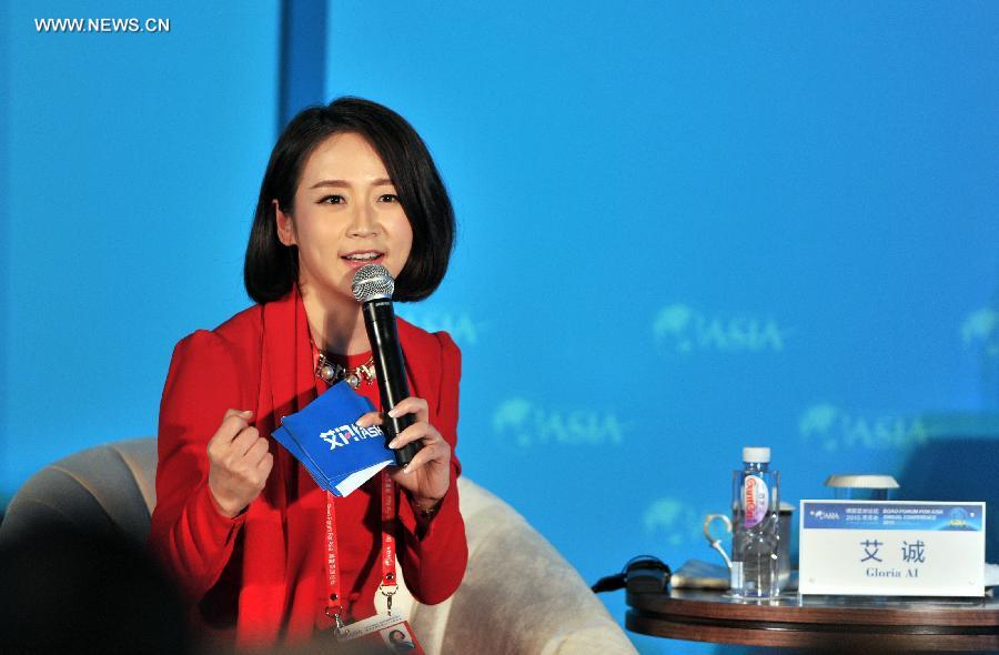 | Gloria Ai, founder of iAsk Media, presides over a sub-forum with the theme of "Entrepreneurs: Born or Made?" at the 2015 Boao Forum for Asia (BFA) in Boao, south China's Hainan Province, March 28, 2015. (Xinhua/Yang Guanyu) |