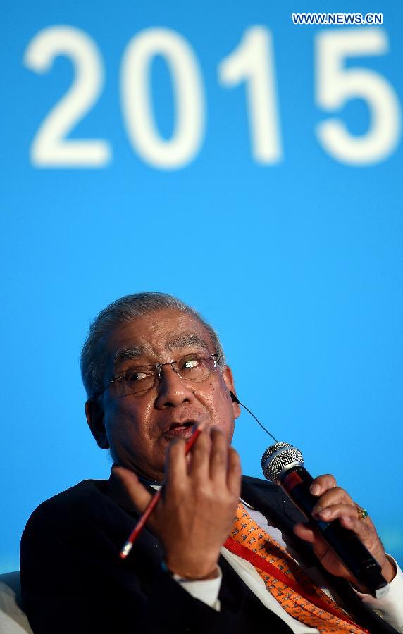 Former President of Confederation of Indian Industry (CII) Shekhar Datta speaks at the sub-forum with the theme of "India: Resetting the Reform Agenda" during the 2015 Boao Forum for Asia (BFA) in Boao, south China's Hainan Province, March 28, 2015. (Xinhua/Guo Cheng)