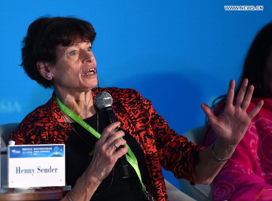 Chief Correspondent for International Finance of "Financial Times" Henny Sender, speaks at the sub-forum with the theme of "India: Resetting the Reform Agenda" during the 2015 Boao Forum for Asia (BFA) in Boao, south China's Hainan Province, March 28, 2015. (Xinhua/Guo Cheng)