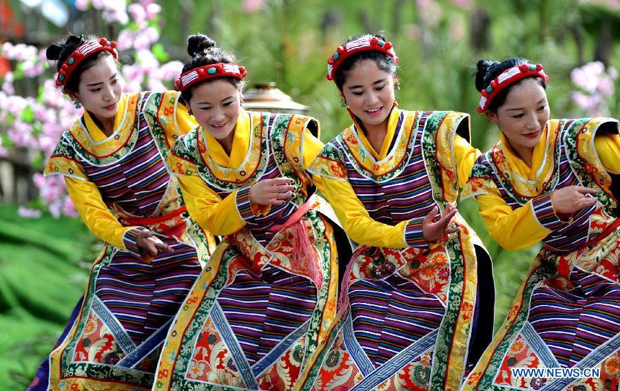 | Folk performers dance during the 13th Nyingchi Peach Blossom Cultural Tourism Festival, in Gala Village of Nyingchi Prefecture, southwest China's Tibet Autonomous Region, March 30, 2015. The 13th Nyingchi Peach Blossom Cultural Tourism Festival kicked off here on Monday, where a series of activities are held for visitors to enjoy the spring view and local culture. (Xinhua/Liu Dongjun) |