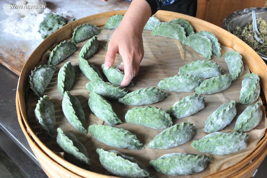 A worker makes Qingtuan, or green rice balls, at a pastry shop in Lin'an City, east China's Zhejiang Province, March 29, 2015. Qingtuan, made from glutinous rice mixed with wormwood juice, is a traditional snack popular among people living in the south of Yangtze River during the Qingming Festival (Tomb Sweeping Day). (Xinhua/Hu Jianhuan)