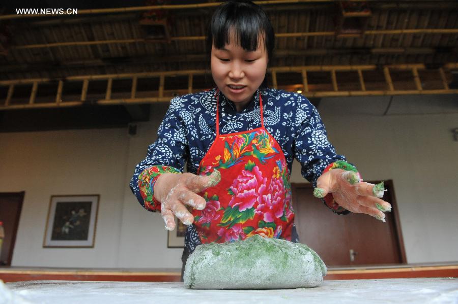 A worker makes Qingtuan, or green rice balls, at a pastry shop in Lin'an City, east China's Zhejiang Province, March 29, 2015. Qingtuan, made from glutinous rice mixed with wormwood juice, is a traditional snack popular among people living in the south of Yangtze River during the Qingming Festival (Tomb Sweeping Day). (Xinhua/Hu Jianhuan)