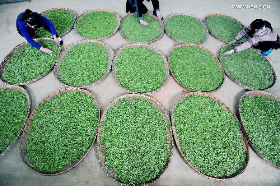 Tea farmers air fresh tea leaves in Zhongxi Village of Rao'er Township of Dexing City, east China's Jiangxi Province, March 29, 2015. Tea makers are making tea with newly-picked tea leaves before the Qingming Festival, which falls on April 5 this year, as tea of this period of time is regarded to have a better taste. (Xinhua/Zhuo Zhongwei)