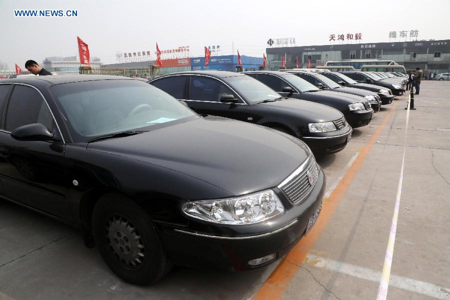 Photo taken on March 30, 2015 shows vehicles during an auction of the second batch of official vehicles in Beijing, capital of China. A total of 103 official vehicles were under the gavel at an auction house in Beijing on March 30. The official cars are among more than 3,000 taken out of service as part of reform measures that began last July to slash spending in this area. (Xinhua/Liu Xianguo)