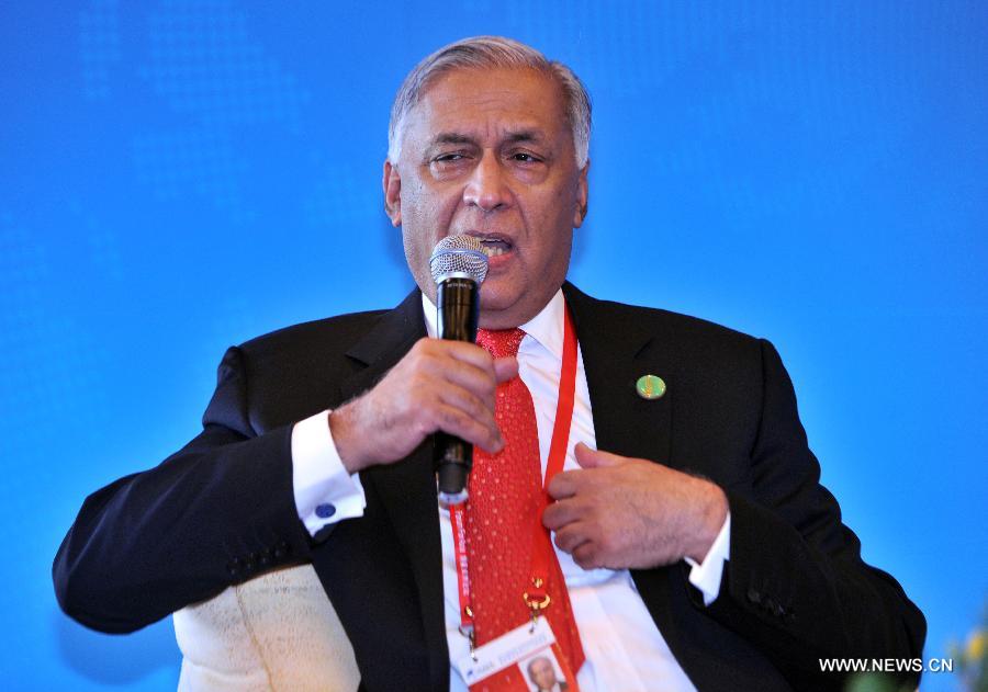 Former Prime Minister of Pakistan Shaukat Aziz speaks at the luncheon with the theme of "Brainstorming: Rethinking Global Governance" during the 2015 Boao Forum for Asia (BFA) in Boao, south China's Hainan Province, March 29, 2015. (Xinhua/Yang Guanyu)