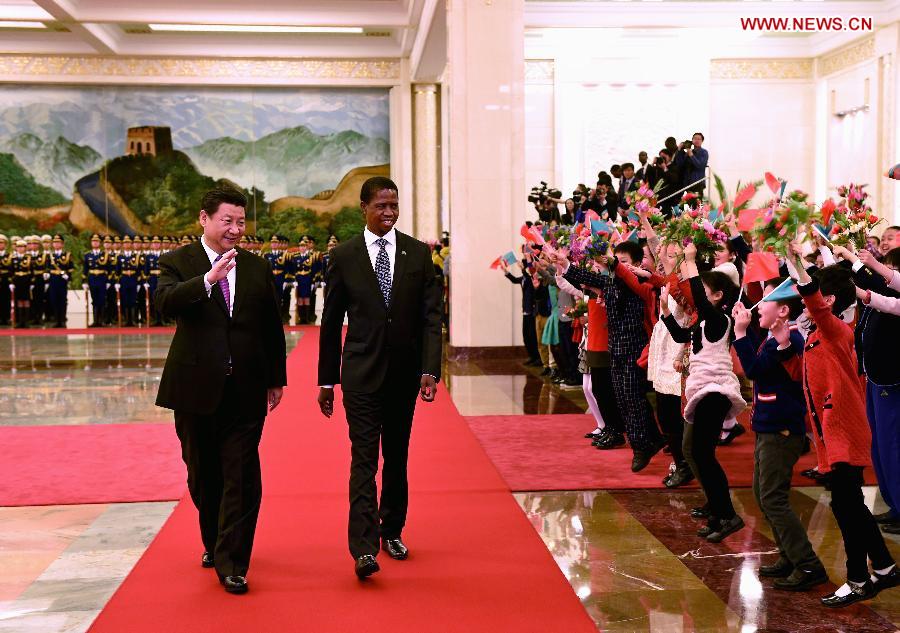 | Chinese President Xi Jinping (L) and Zambian President Edgar Lungu (R) attend a welcome ceremony in Beijing, capital of China, March 30, 2015. (Xinhua/Rao Aimin) |
