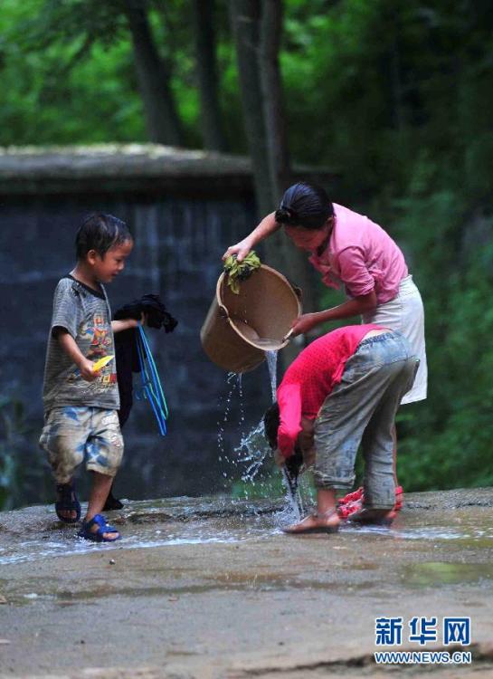 Students wash hair in the school on June 17, 2014. The school has built a large water tank. (Xinhua/Huang Xiaobang)
