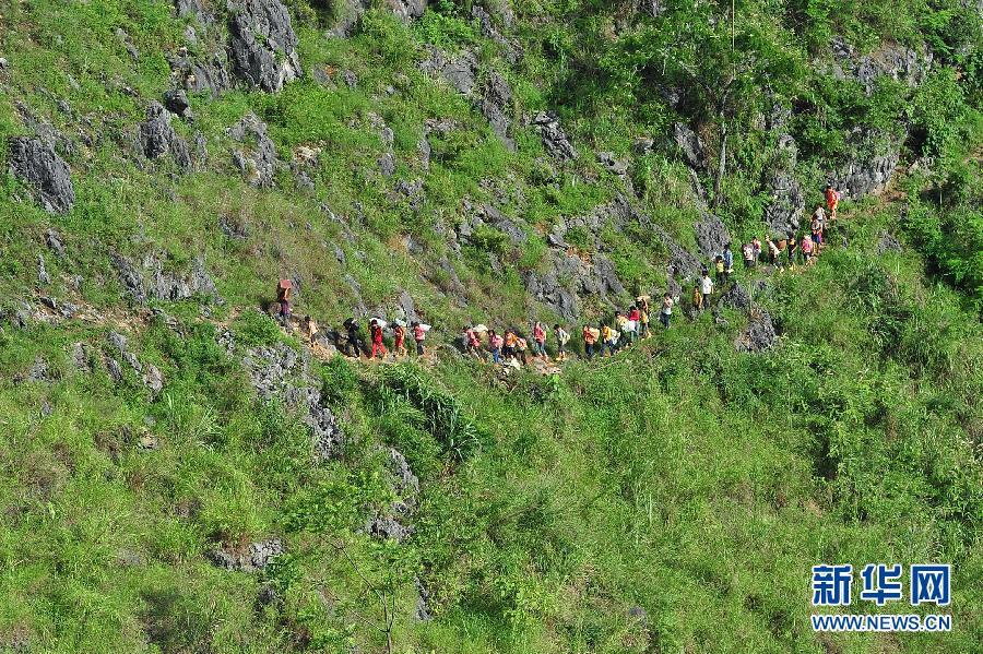 Carrying the supplies, the children return home from school on July 4, 2012. (Xinhua/Huang Xiaobang)
