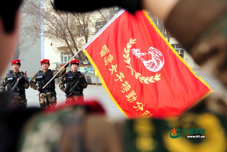 | Team members of "Snow Eagle", a female detachment of Xinjiang Border Guard Corps, participate in the establishment ceremony on March 11, 2015. (Chinamil.com.cn/Fan Xinyu) |