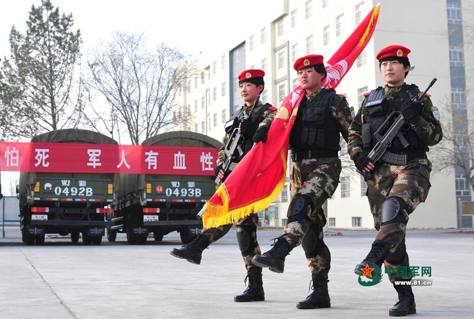 Team members of "Snow Eagle", a female detachment of Xinjiang Border Guard Corps, participate in the establishment ceremony on March 11, 2015. (Chinamil.com.cn/Fan Xinyu)