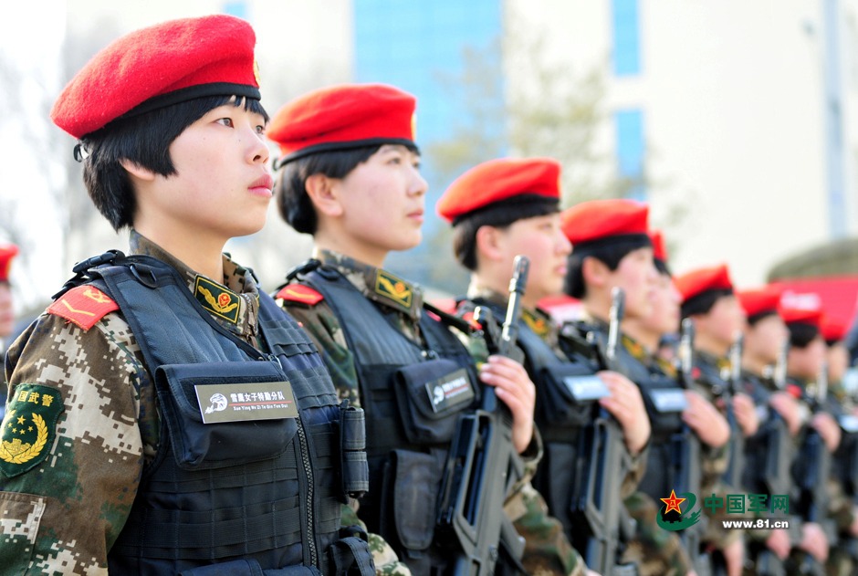 Team members of "Snow Eagle", a female detachment of Xinjiang Border Guard Corps, participate in the establishment ceremony on March 11, 2015. (Chinamil.com.cn/Fan Xinyu)