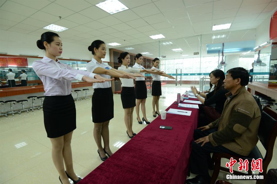 Students wearing uniforms compete for flight attendants positions at a normal school in south China's Guangxi on March 25, 2015. (CNS/Hu Ying)