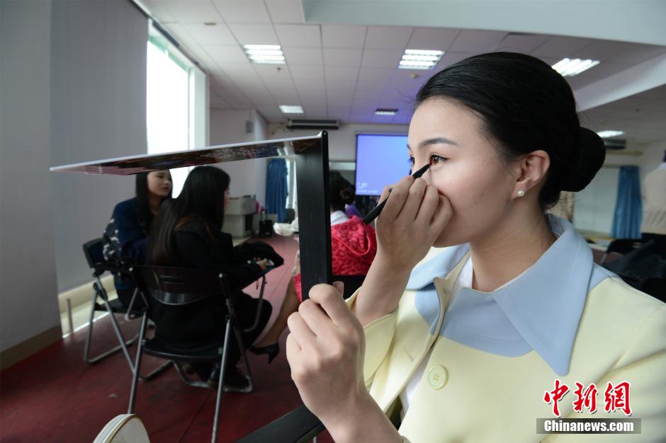 Students wearing uniforms compete for flight attendants positions at a normal school in south China's Guangxi on March 25, 2015. (CNS/Hu Ying)