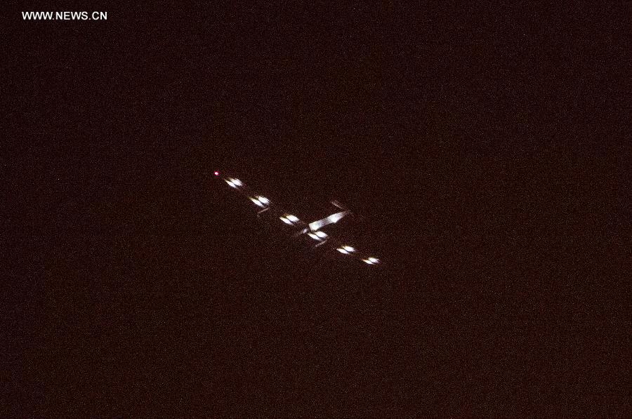 The Solar Impulse 2, the world's biggest solar-powered plane, prepares to land at Chongqing Jiangbei International Airport in Chongqing, southwest China, March 31, 2015. The plane, after a 19-hour flight from Myanmar, made its debut in China on Tuesday morning, on the fifth leg of its round-the-world journey to raise awareness of renewable energy and environmental protection. (Xinhua/Liu Chan)