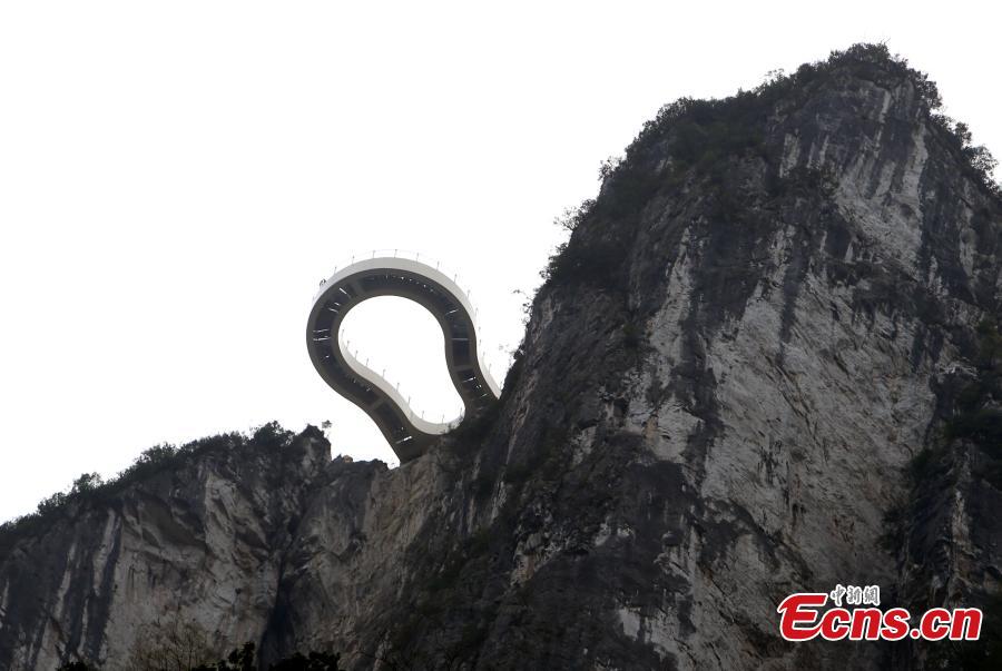 | Workers are finishing the construction of a glass cantilever bridge in Longgang scenic area in Yunyang, Southwest China's Chongqing municipality. The transparent structure, 718 meters above the ground, has a cantilever extending 26.64 meters from the edge, five meters longer than the Grand Canyon Skywalk. The project, with a total investment of 35 million yuan($5.6 million), started in March 2014. The bridge has a carrying capacity of 1000 tons.(Photo: China News Service/Zhong Xin) |