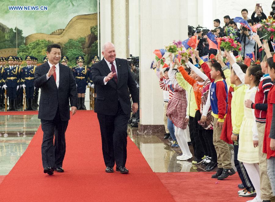 Chinese President Xi Jinping (L) holds a welcoming ceremony for Australian Governor-General Peter Cosgrove at the Great Hall of the People in Beijing, March 30, 2015. (Xinhua/Li Xueren)