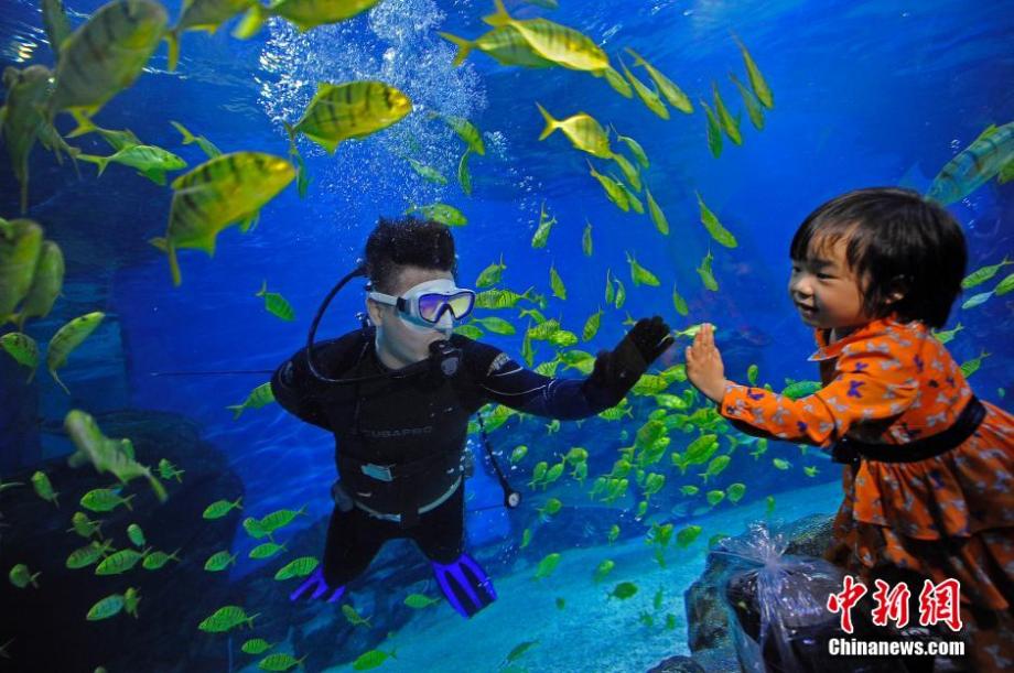 Guided by the staff, visitors spend a whole night in an aquarium to explore the night world of fishes which has never been revealed before in Tianjin on March 28, 2015. (CNS/Tong Yu)