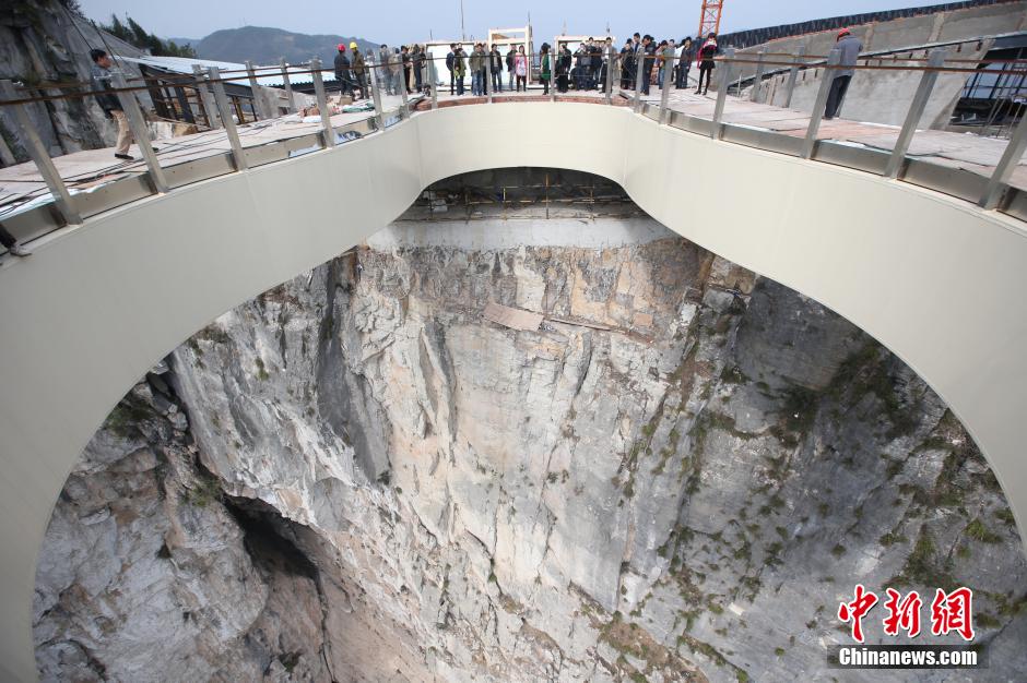 The world's longest glass cantilever bridge in Yunyang county, Chongqing, will be opened to tourists on May 1. The "Cloud bridge" is built on top of the cliffs 1,123 meters above sea level. The bridge is about 3.4 meters wide and 50 meters long, with a shape of flower. When one stands on it, he will feel totally "suspended" in the air without any line in sight. (Photo/CNS)