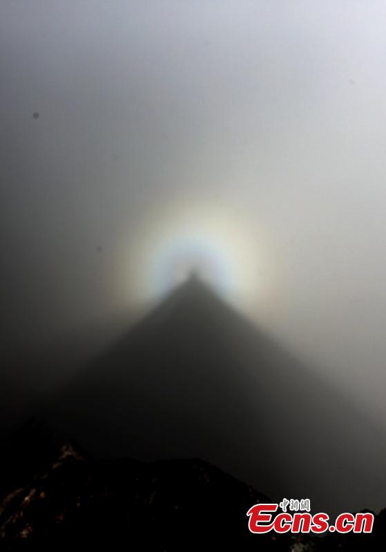 | 'Buddha's light,'a unique light phenomenon is seen on a peak of Mount Huangshan scenic spot in Huangshan city, East China's Anhui province on March 31, 2015. The special light effect only appears a couple of times per month on the mountain. (Photo:China News Service/ Shi Guangde) |