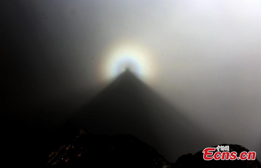 'Buddha's light,'a unique light phenomenon is seen on a peak of Mount Huangshan scenic spot in Huangshan city, East China's Anhui province on March 31, 2015. The special light effect only appears a couple of times per month on the mountain. (Photo:China News Service/ Shi Guangde)