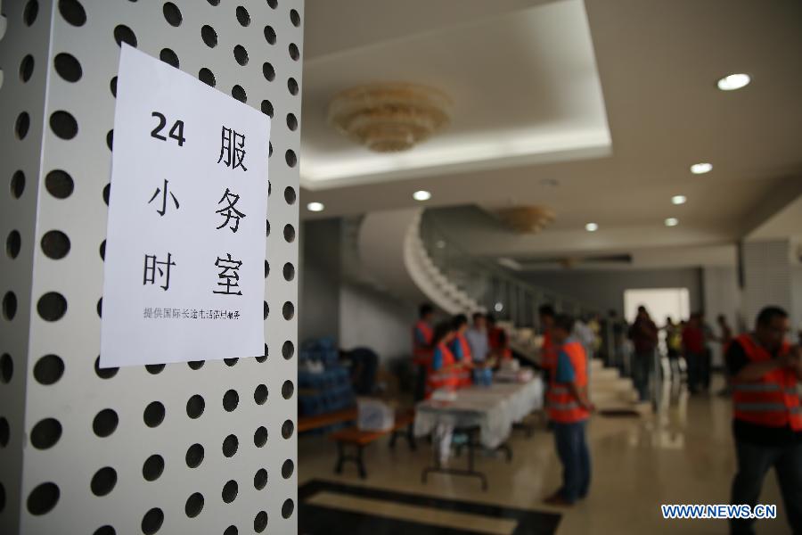 | Vorlunteers work at a 24-hours service room at the temporary rest center in Hassan Gouled in Djibouti, March 31, 2015. More than 500 Chinese evacuees from conflict-ridden Yemen have arrived at the Djibouti port as the situation continues to deteriorate in Yemen. (Xinhua/Pan Siwei) |