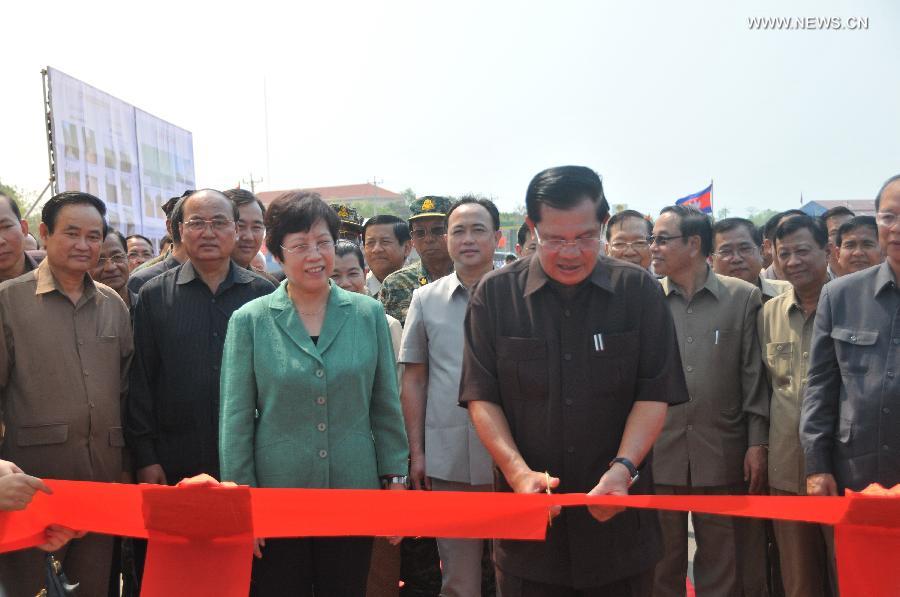 Cambodian Prime Minister Hun Sen (Front) cuts the ribbon to inaugurate a bridge and a road in Stung Treng province, Cambodia, April 1, 2015. Cambodia inaugurated a 1.73km Mekong River bridge, along with a 143km road, here on Wednesday in a bid to boost economic development and reduce poverty in this far northeastern region. (Xinhua/Li Hong)
