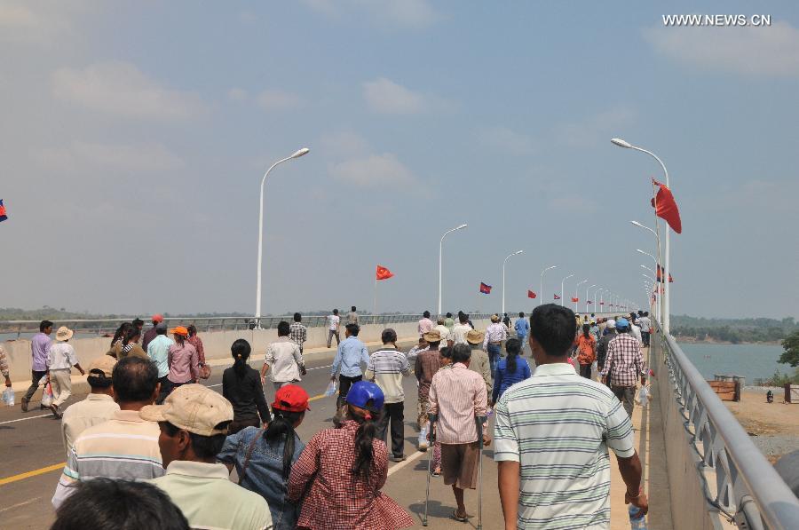 | People walk on the Mekong River bridge in Stung Treng province, Cambodia, April 1, 2015. Cambodia inaugurated a 1.73km Mekong River bridge, along with a 143km road, here on Wednesday in a bid to boost economic development and reduce poverty in this far northeastern region. (Xinhua/Li Hong) |