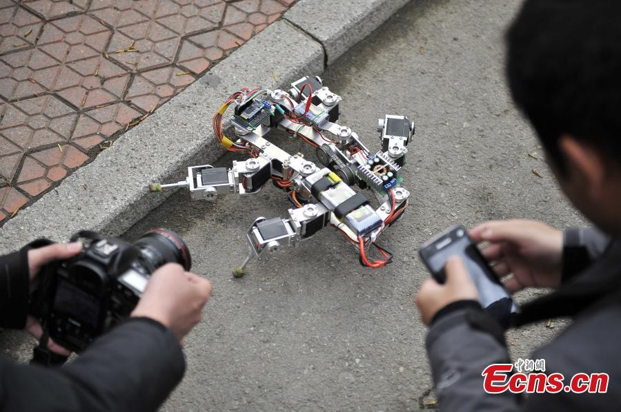 | A student operates a robot with his cell phone to cross a barrier at the Tianjin University in North China’s Tianjin municipality, April 1, 2015. The multi-foot robot, the third generation developed by students of the university, can fold itself up and crawl away like a crab in different ground conditions, allowing a wider range of applications in aerospace, geological survey, and relief work. (Photo: China News Service/Tong Yu) |