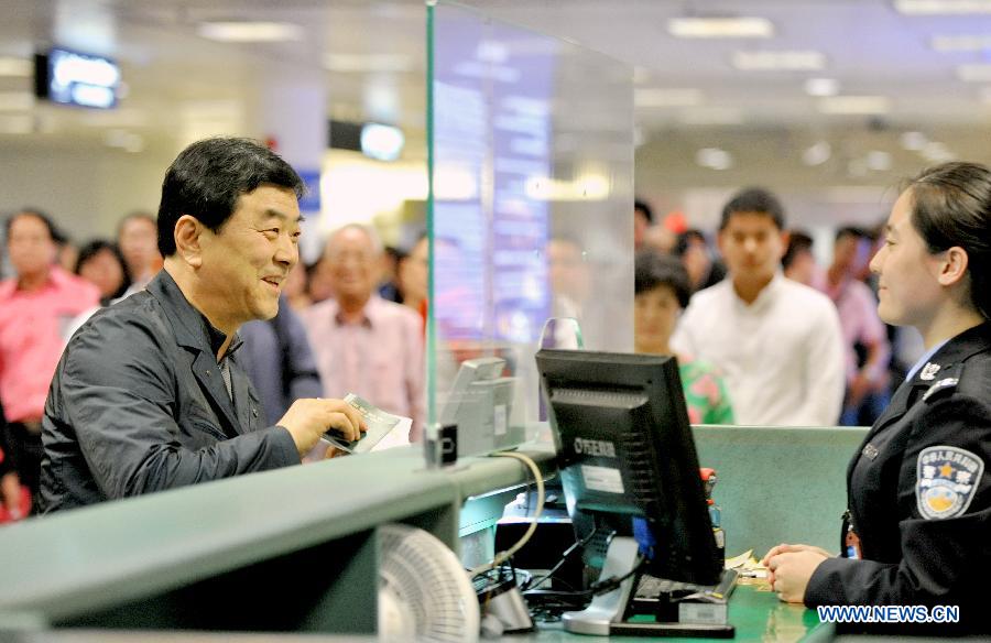 A passenger from South Korea (L) have his passport checked in Xiamen, southeast China's Fujian Province, April 2, 2015. The first group of passengers with a 72-hour visa-free stay in Xiamen reached Xiamen Gaoqi International Airport Thursday. Xiamen started to allow 72-hour transit visa exemptions for foreign nationals from 51 countries and regions from Wednesday. (Xinhua/Lin Shanchuan)