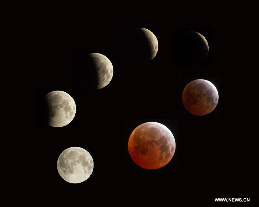 The combined photo taken on April 4, 2015 shows the process of a total lunar eclipse observed at Santa Monica Beach in Santa Monica, California, United States. According to astronomical data, the eclipse is the shortest one since the 21st century as the totality lasted only for 12 minutes. (Xinhua/Zhao Hanrong)