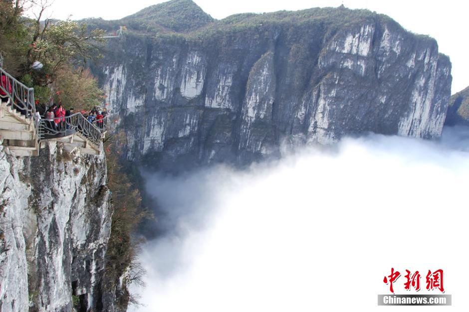 A sea of clouds appears at Tianmen mountain at Zhangjiajie, central China's Hunan province on March 30, 2015. Tourists can even see the light of Buddha under the glass plank road. (CNS/Ding Yunjuan)