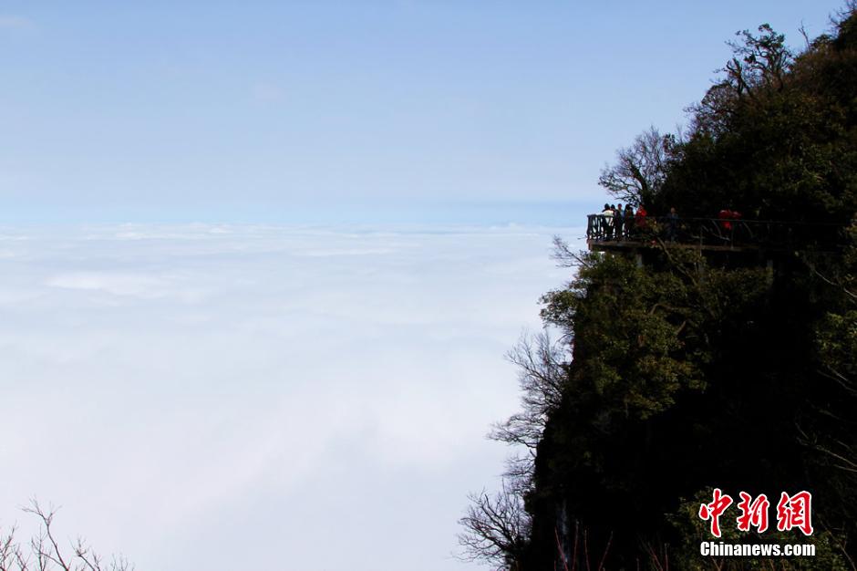 A sea of clouds appears at Tianmen mountain at Zhangjiajie, central China's Hunan province on March 30, 2015. Tourists can even see the light of Buddha under the glass plank road. (CNS/Ding Yunjuan)
