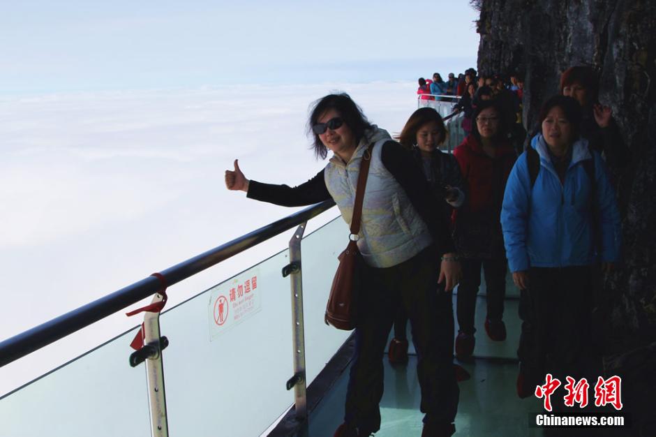 A sea of clouds appears at Tianmen mountain at Zhangjiajie, central China's Hunan province on March 30, 2015. Tourists can even see the light of Buddha under the glass plank road. (CNS/Ding Yunjuan)