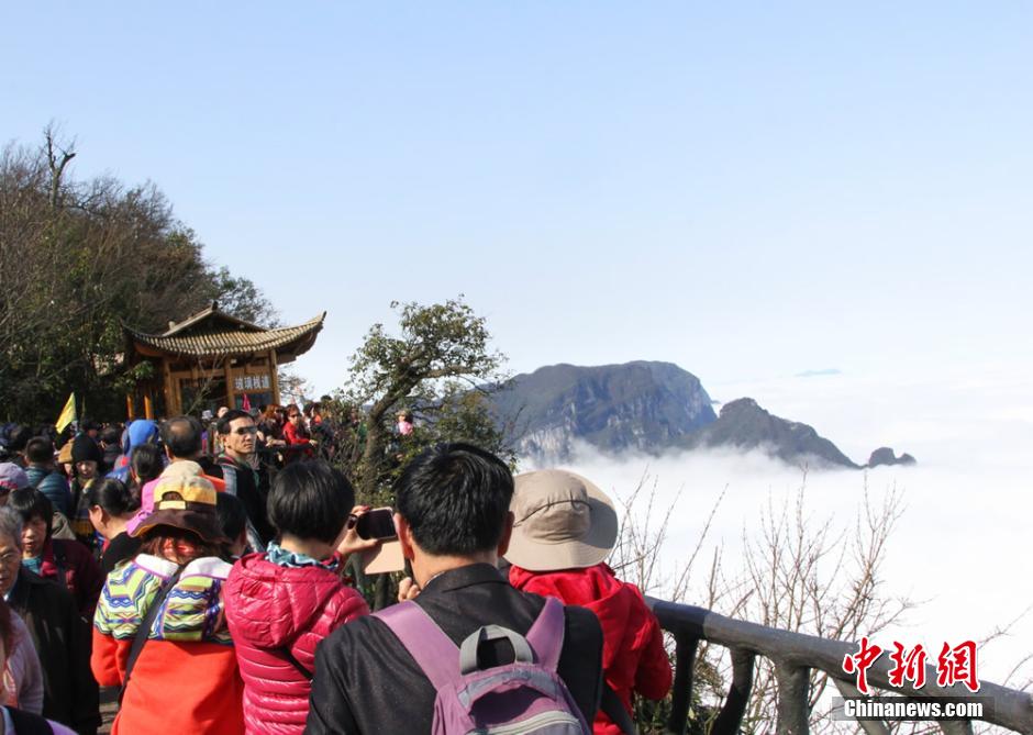 A sea of clouds appears at Tianmen mountain at Zhangjiajie, central China's Hunan province on March 30, 2015. Tourists can even see the light of Buddha under the glass plank road. (CNS/Ding Yunjuan)